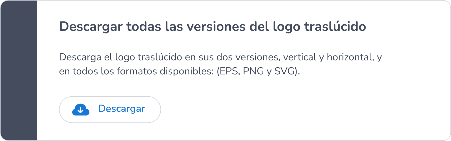 - Logo en versión traslúcida: debe emplearse únicamente en casos donde el color de fondo no permita una correcta apreciación de la marca. Esta versión puede aplicarse sobre fondos de color plano que presenten un alto nivel de contraste.