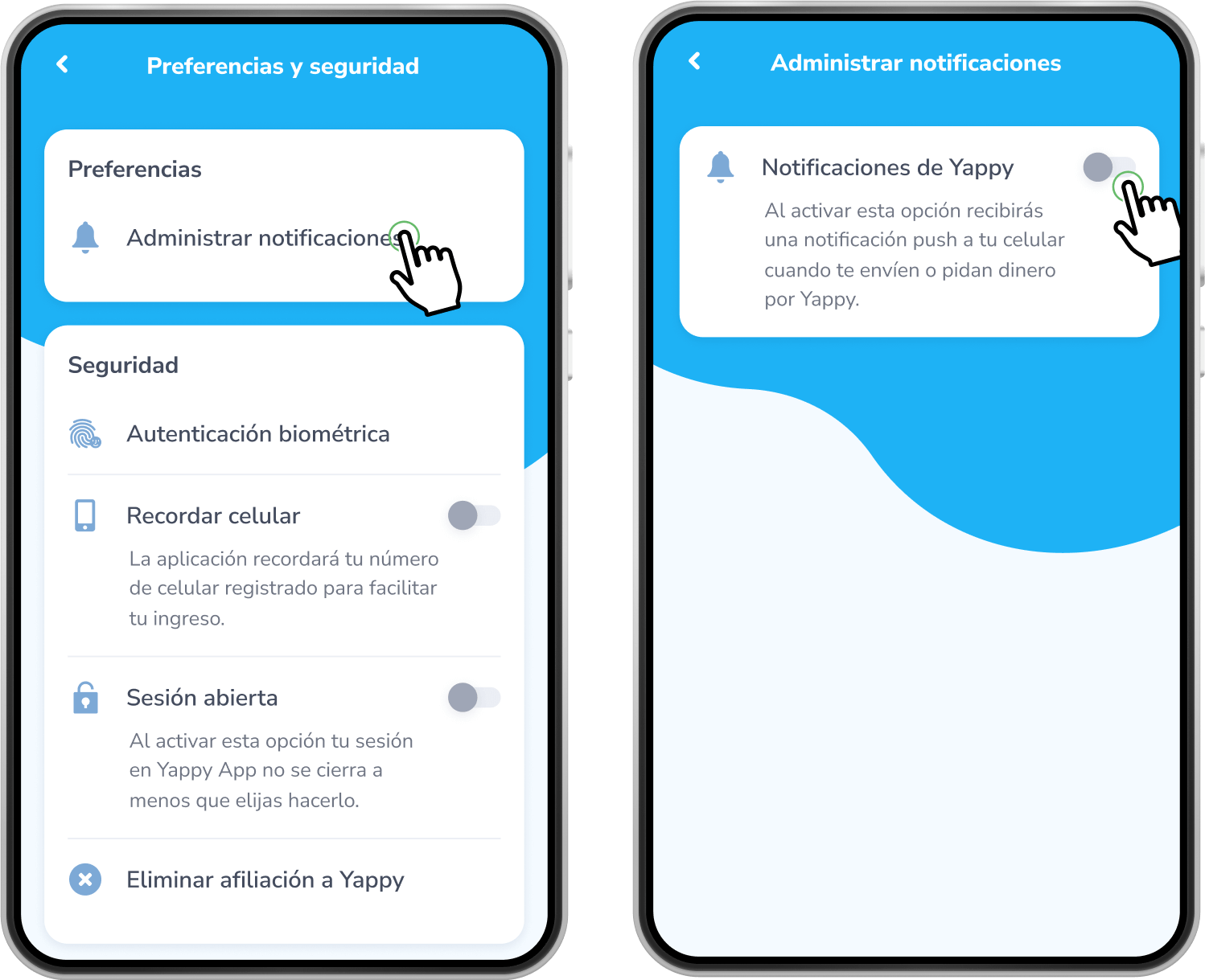 Para desactivar las notificaciones de Yappy, en la sección Preferencias, presiona Administrar notificaciones. Luego toca el botón, al tornarse gris significa que desactivaste las notificaciones.