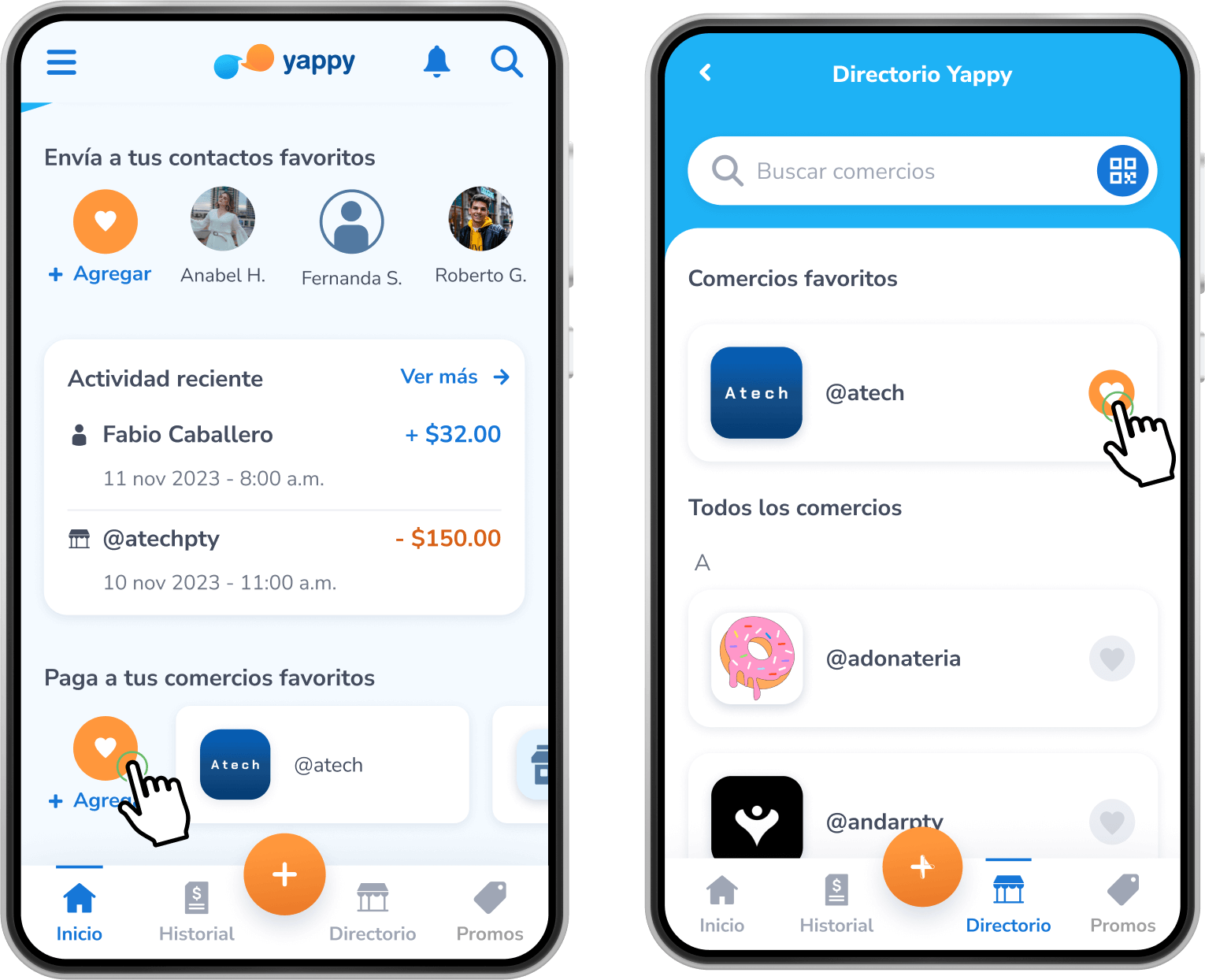 En la pantalla de inicio, en la sección Envía a tus comercios favoritos toca Agregar. En el directorio Yappy, selecciona el corazón gris junto al nombre del comercio que deseas agregar como favorito.