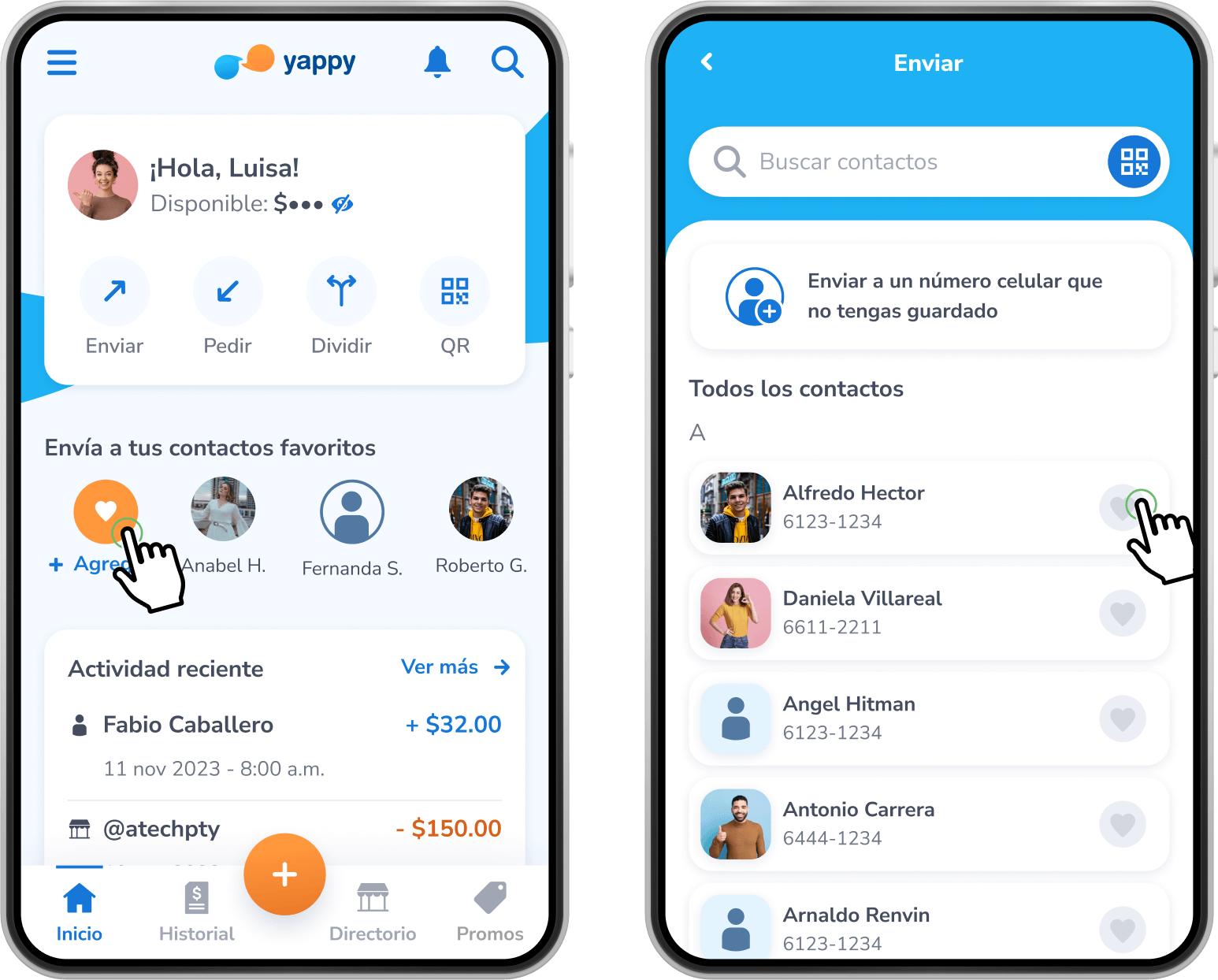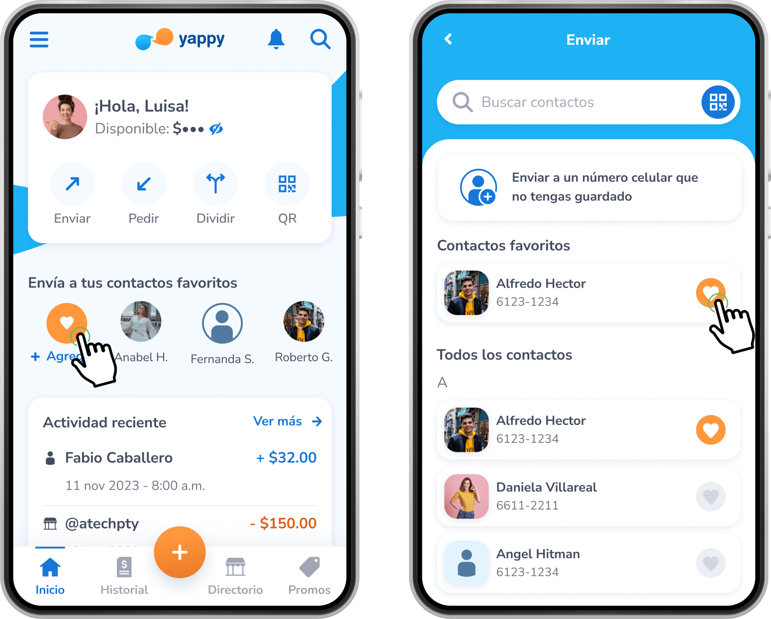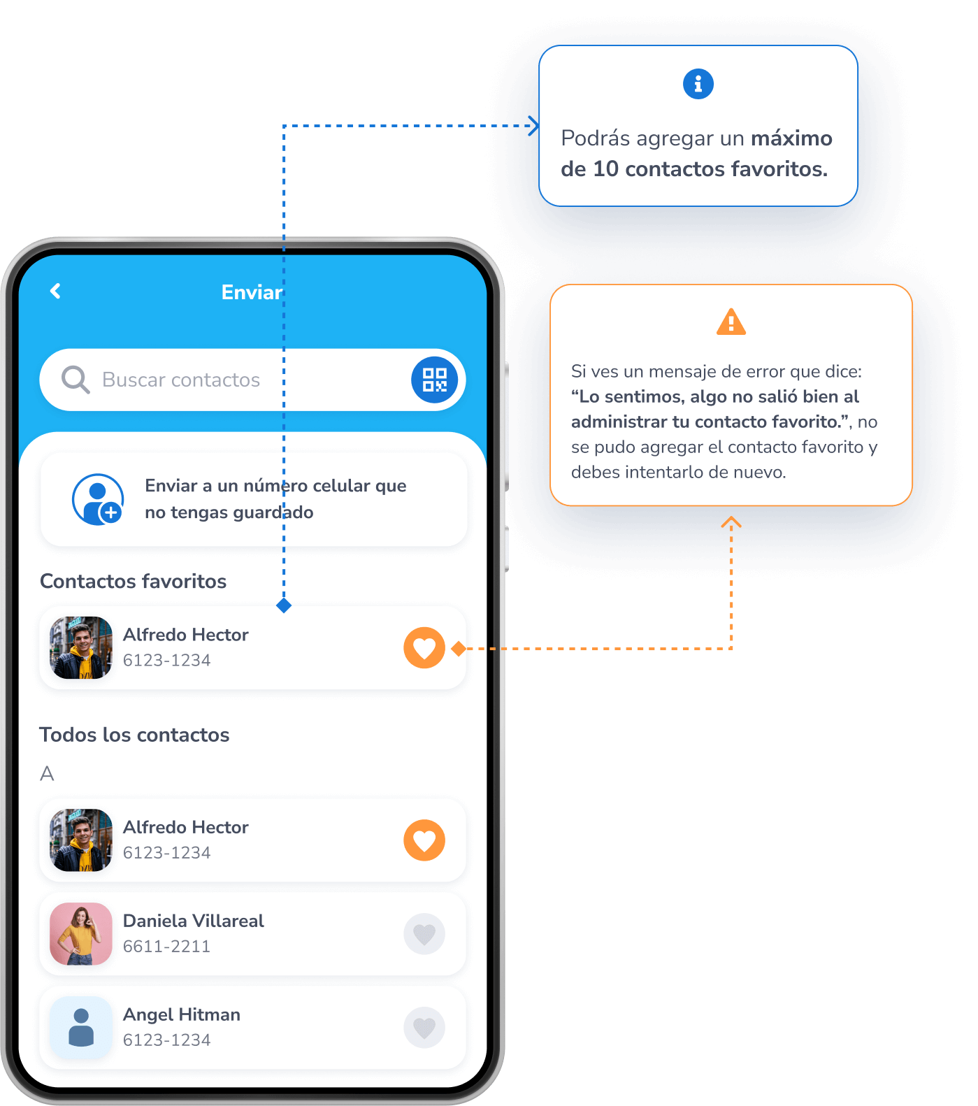En la pantalla de inicio, en la sección Envía a tus contactos favoritos toca Agregar. En tu lista de contactos, selecciona el corazón gris junto al nombre del contacto que deseas agregar como favorito. Cuando el corazón se torna naranja, significa que agregaste el contacto a tus favoritos.