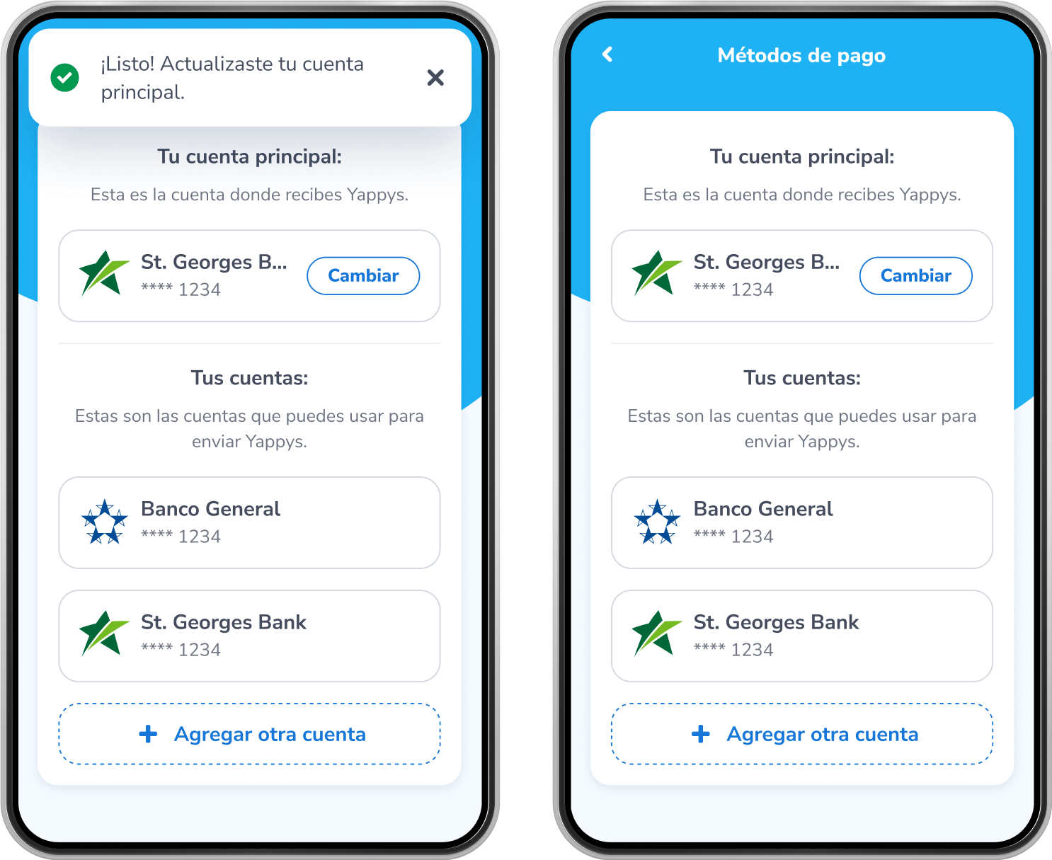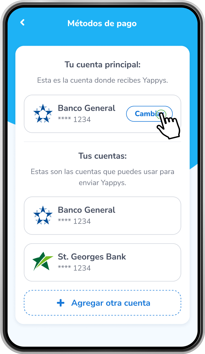 Tu cuenta principal es donde recibes los Yappys que te envían y también es la cuenta que aparecerá como predeterminada a la hora de enviar un Yappy.