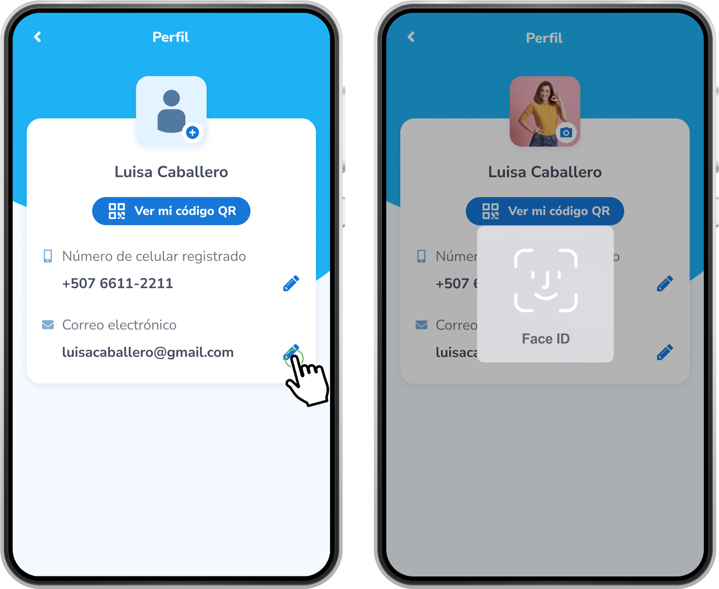 Presiona el lápiz de editar que está ubicado al lado de tu número de celular registrado. Por tu seguridad, Yappy App te pedirá tu autenticación biométrica (huella o rostro) o PIN para validar que eres tú.