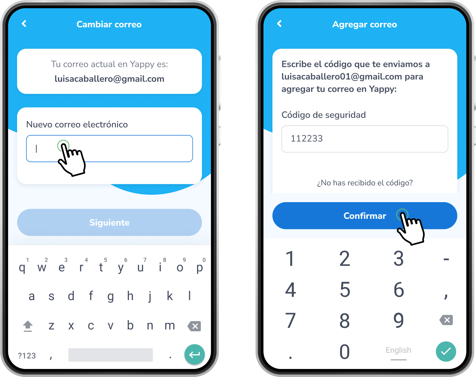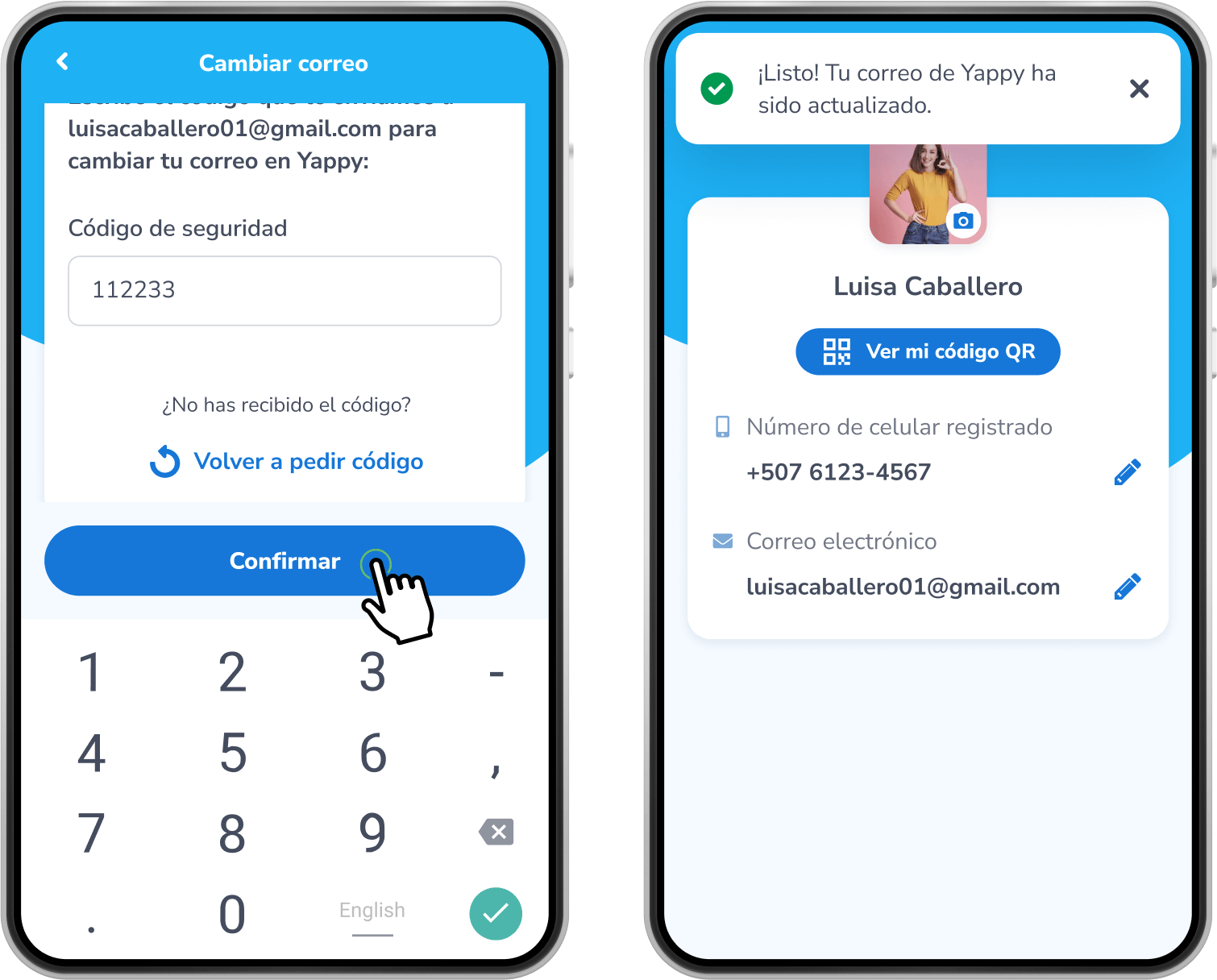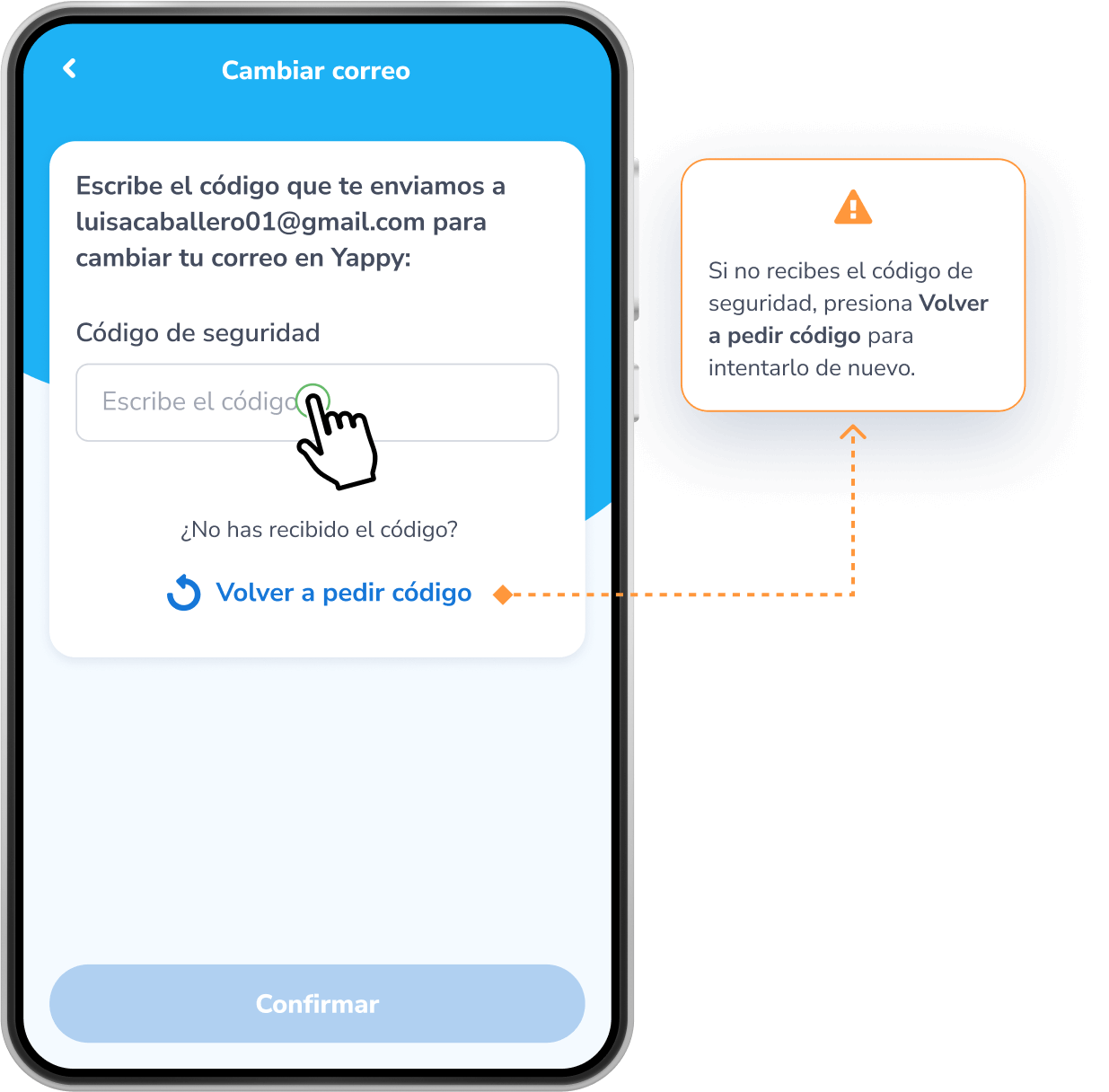 Finalmente, escribe el código de seguridad que te enviamos a tu correo electrónico nuevo y toca Confirmar para terminar de cambiar tu correo electrónico.