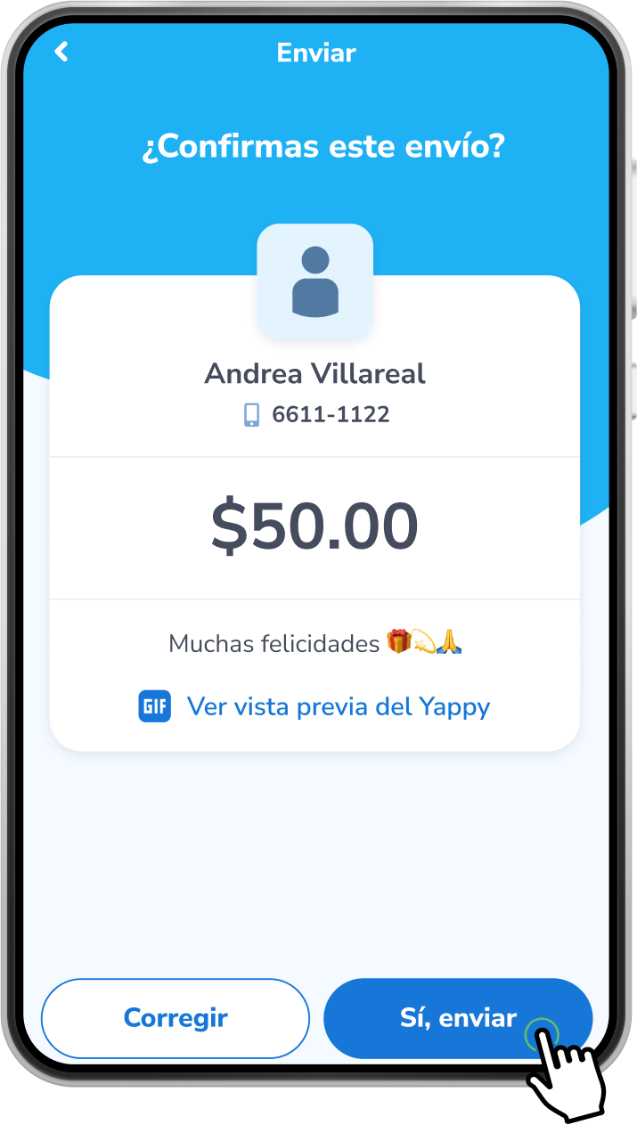 Revisa que la información es correcta y toca Sí, enviar para confirmar el envío de tu Yappy.
