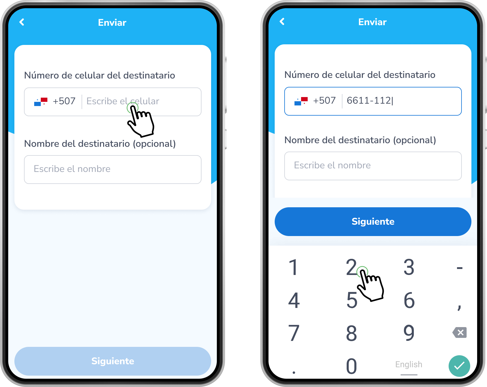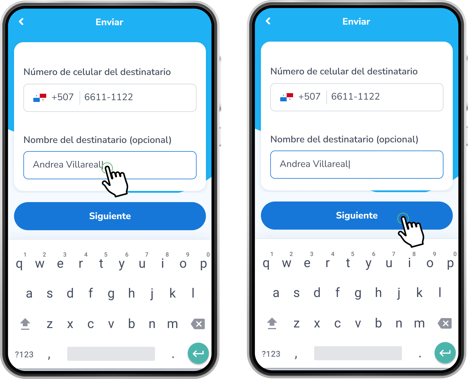 Ingresa el Número de celular del destinatario al cual le quieres enviar un Yappy y escribe el Nombre (este es opcional). Ahora, toca Siguiente.