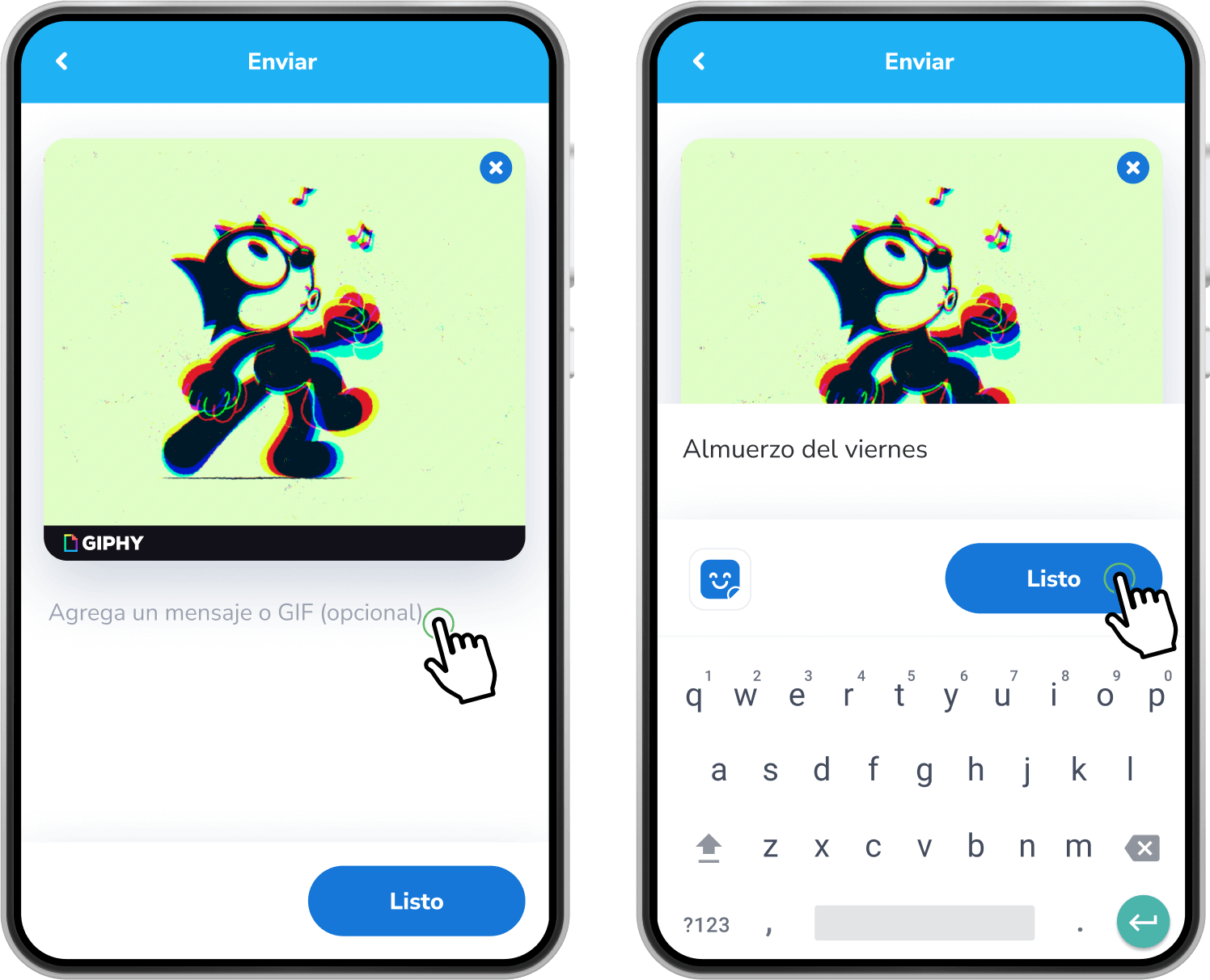 Al agregar el monto deseado, podrás escribir un mensaje opcional al cual le podrás agregar emojis o GIFs. Al terminar de escribir tu mensaje, toca Listo y luego Siguiente para continuar.
