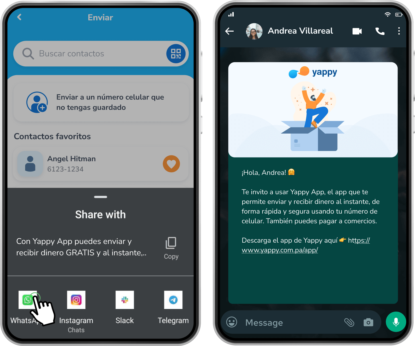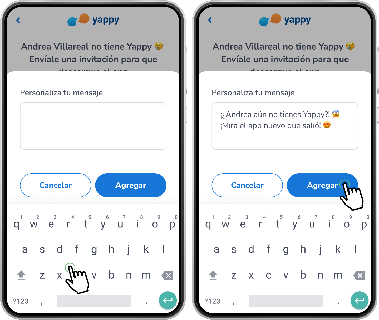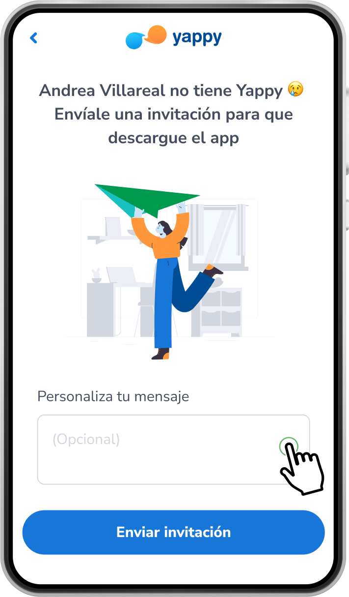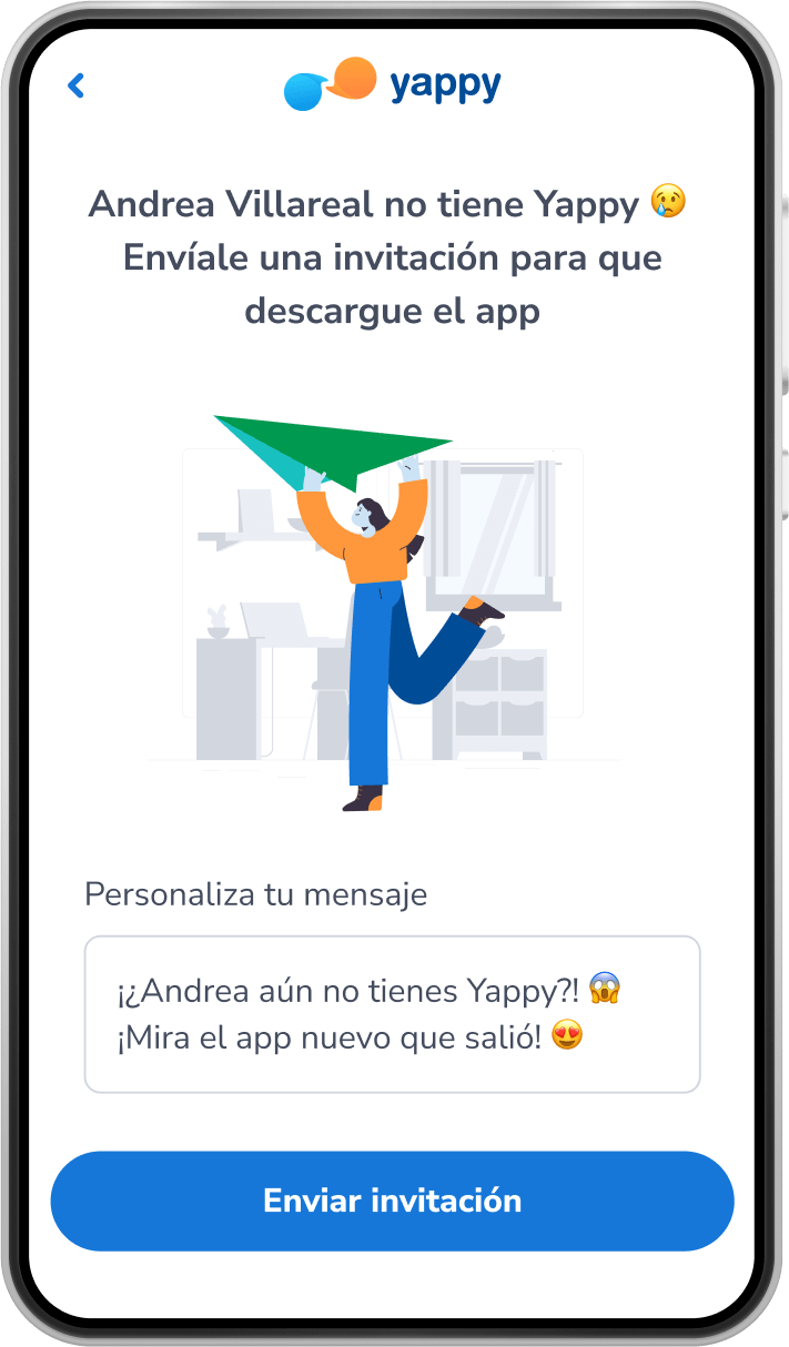 Al detectar que el contacto no está afiliado a Yappy, verás una pantalla en la cual podrás mandarle una invitación a tu contacto para descargar Yappy App.