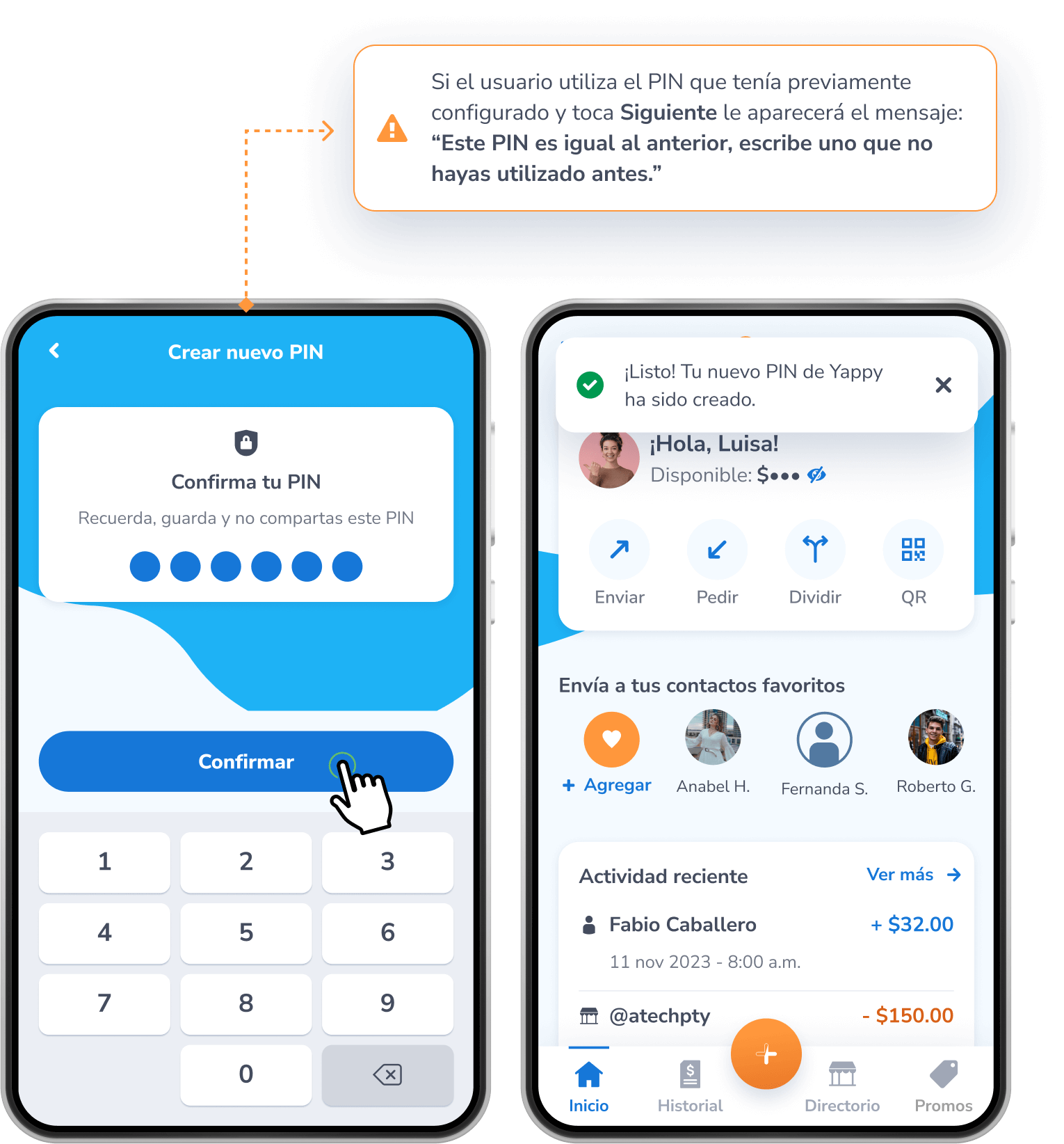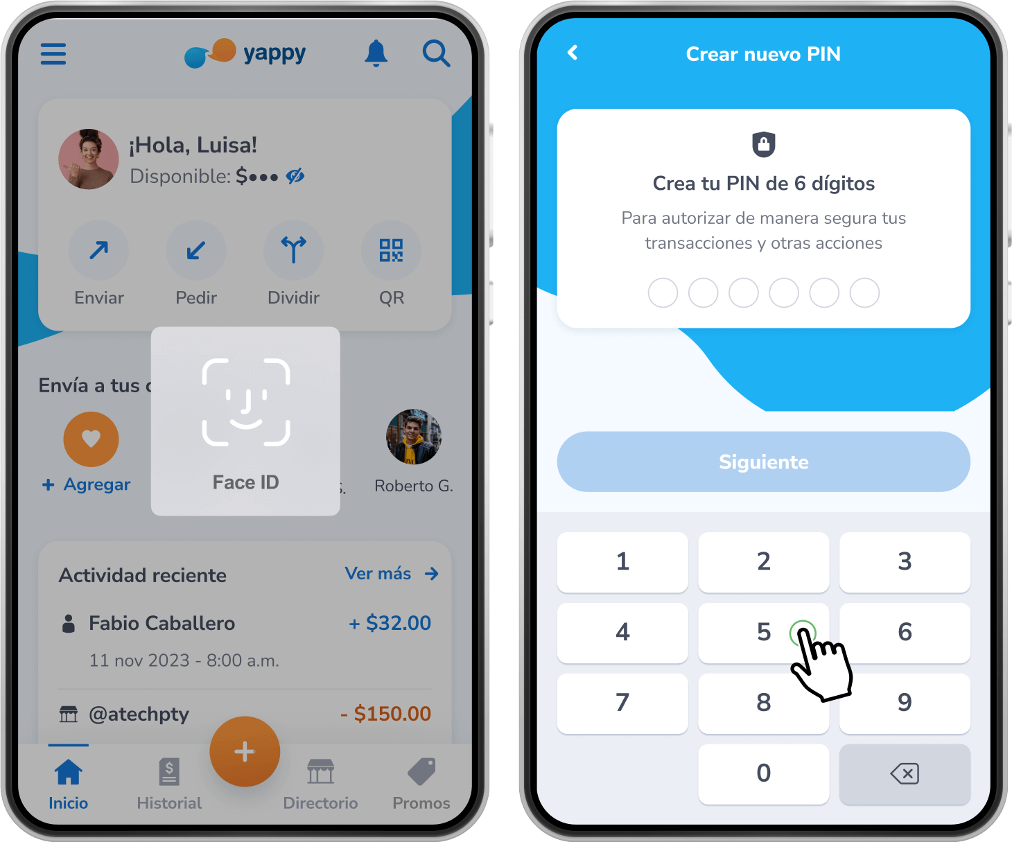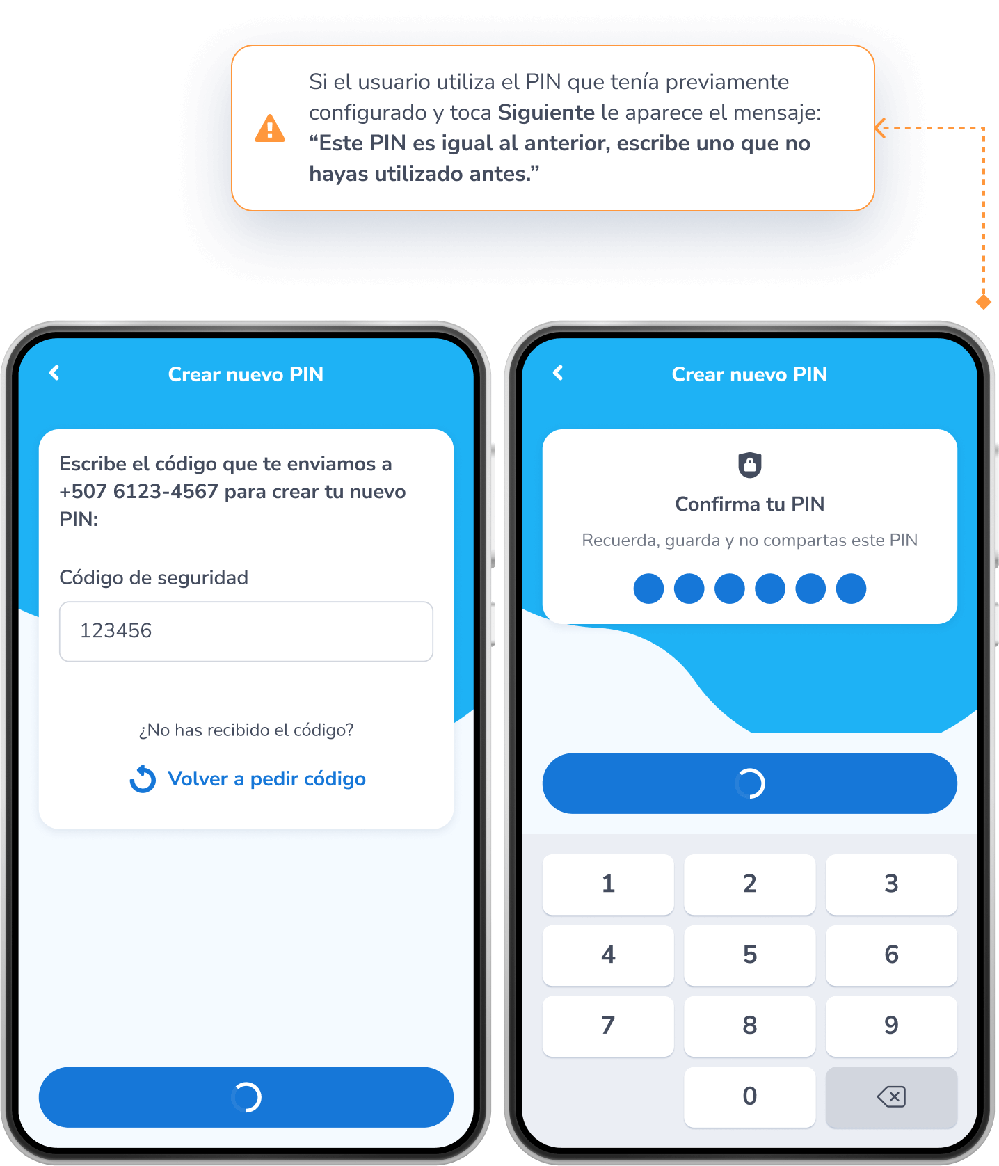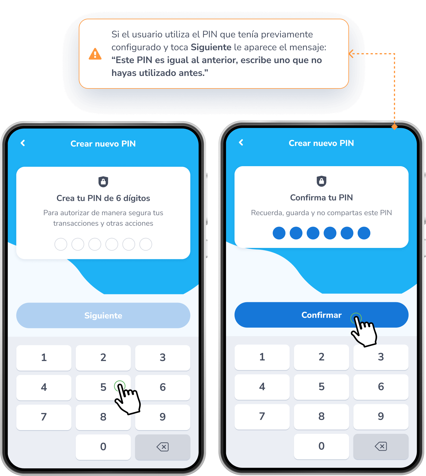 Tu dispositivo leerá tu huella o reconocimiento facial para validar tu identidad. Luego crea tu nuevo PIN de 6 dígitos y toca Confirmar.