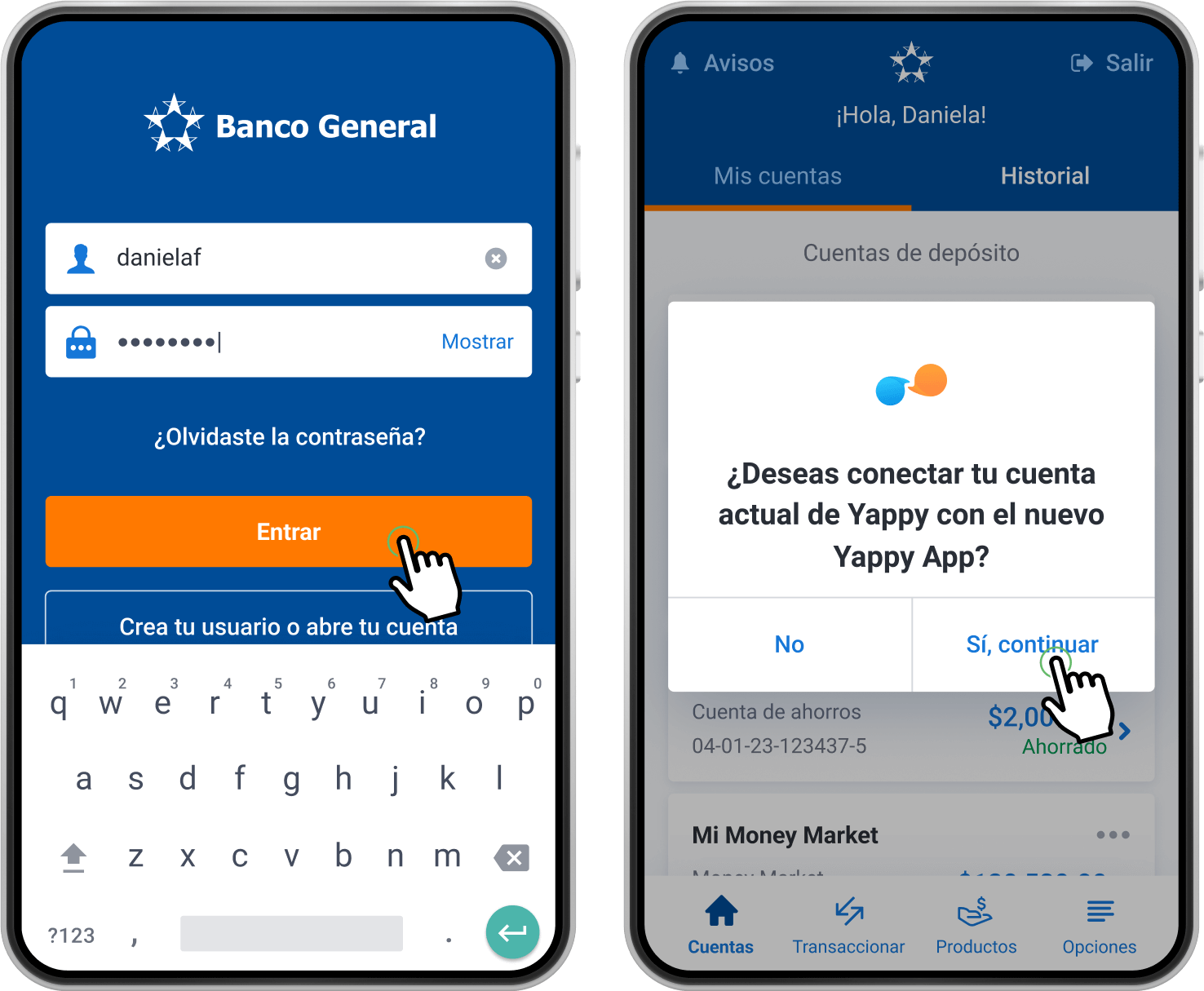 Ya dentro del app, deberás iniciar sesión con tu usuario y contraseña y presionar Entrar. Luego verás un mensaje que dice: “¿Deseas conectar tu cuenta actual de Yappy con el nuevo Yappy App?”. Al tocar Sí, continuar autorizarás la conexión de tu cuenta bancaria a Yappy App y podrás continuar con el registro.