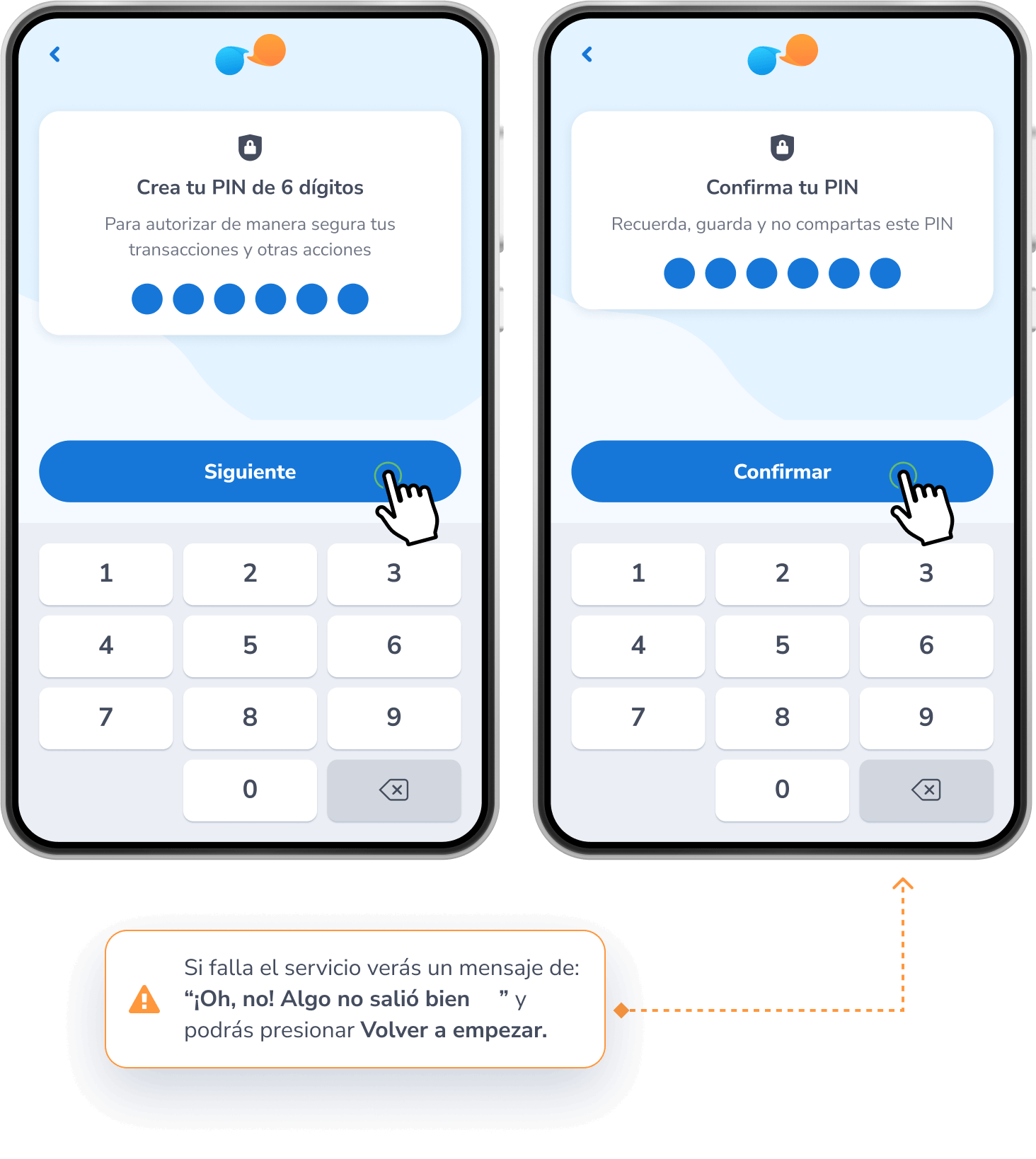 Crea tu PIN de 6 dígitos el cual utilizarás para autorizar transacciones y otras acciones importantes dentro del app. Al finalizar, toca Confirmar.