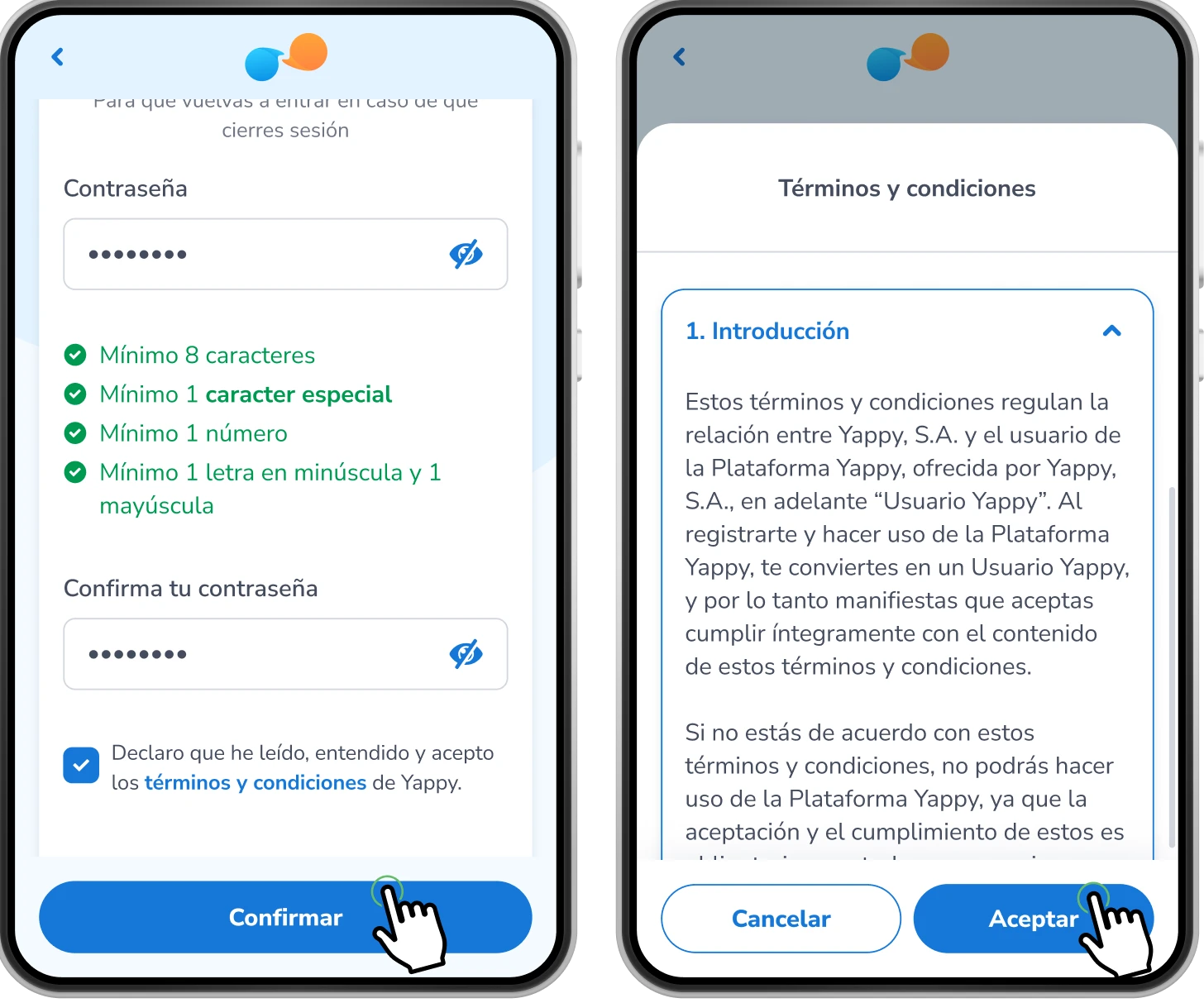 Ahora debes crear una nueva contraseña para Yappy App de acuerdo a los requerimientos de seguridad. Luego escríbela nuevamente para confirmar que es correcta y acepta los términos y condiciones marcando la casilla.