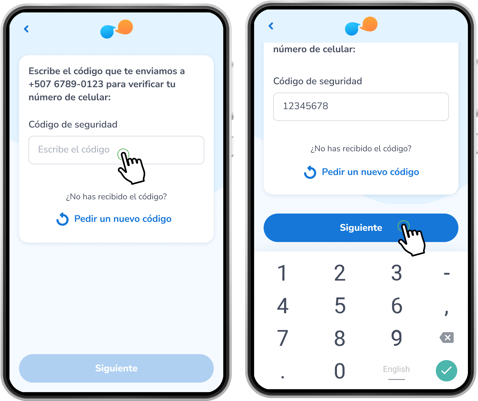 Escribe el número de celular que quieres registrar en Yappy y confirma que está correctamente escrito. Luego, escribe el código de verificación que te llegará por SMS para validar que eres tú.