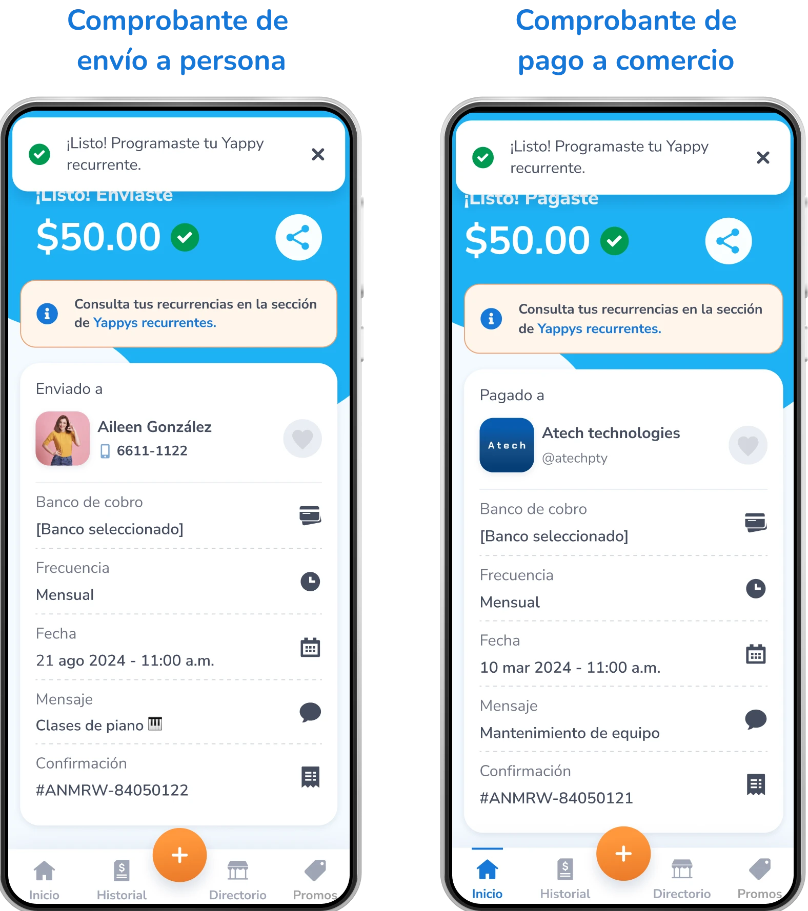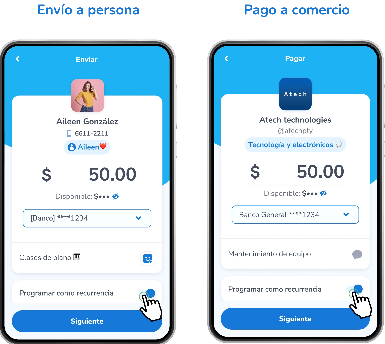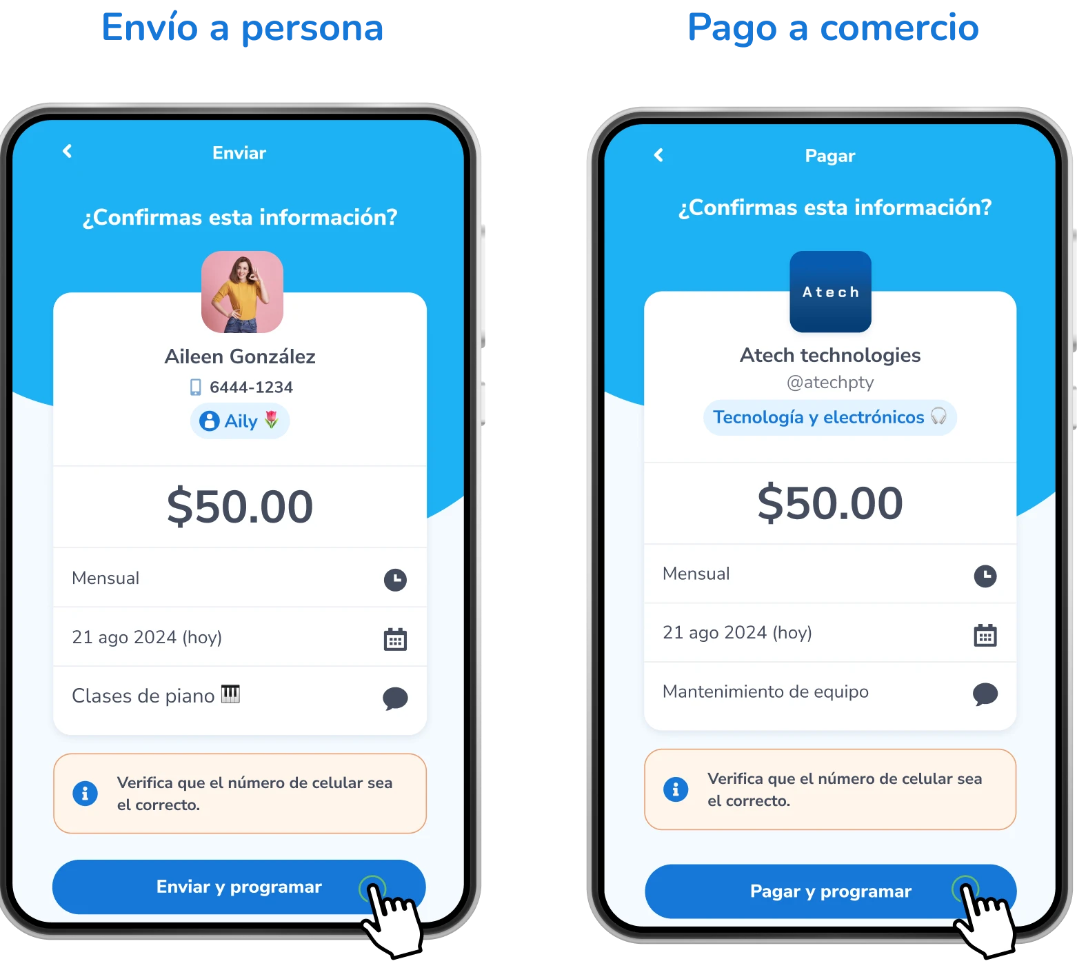 Una vez verifiques la información presiona Enviar y programar para enviar el Yappy a una persona o Pagar y programar para pagar a un comercio.