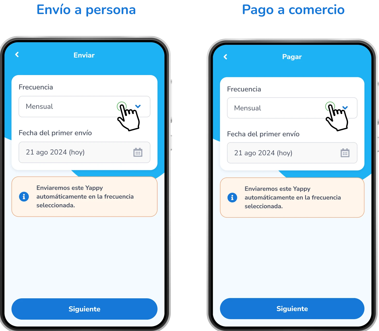 Una vez que indiques si la frecuencia será semanal, quincenal, mensual o anual, selecciona la fecha en la que quieres que se realice el primer envío y presiona Siguiente.